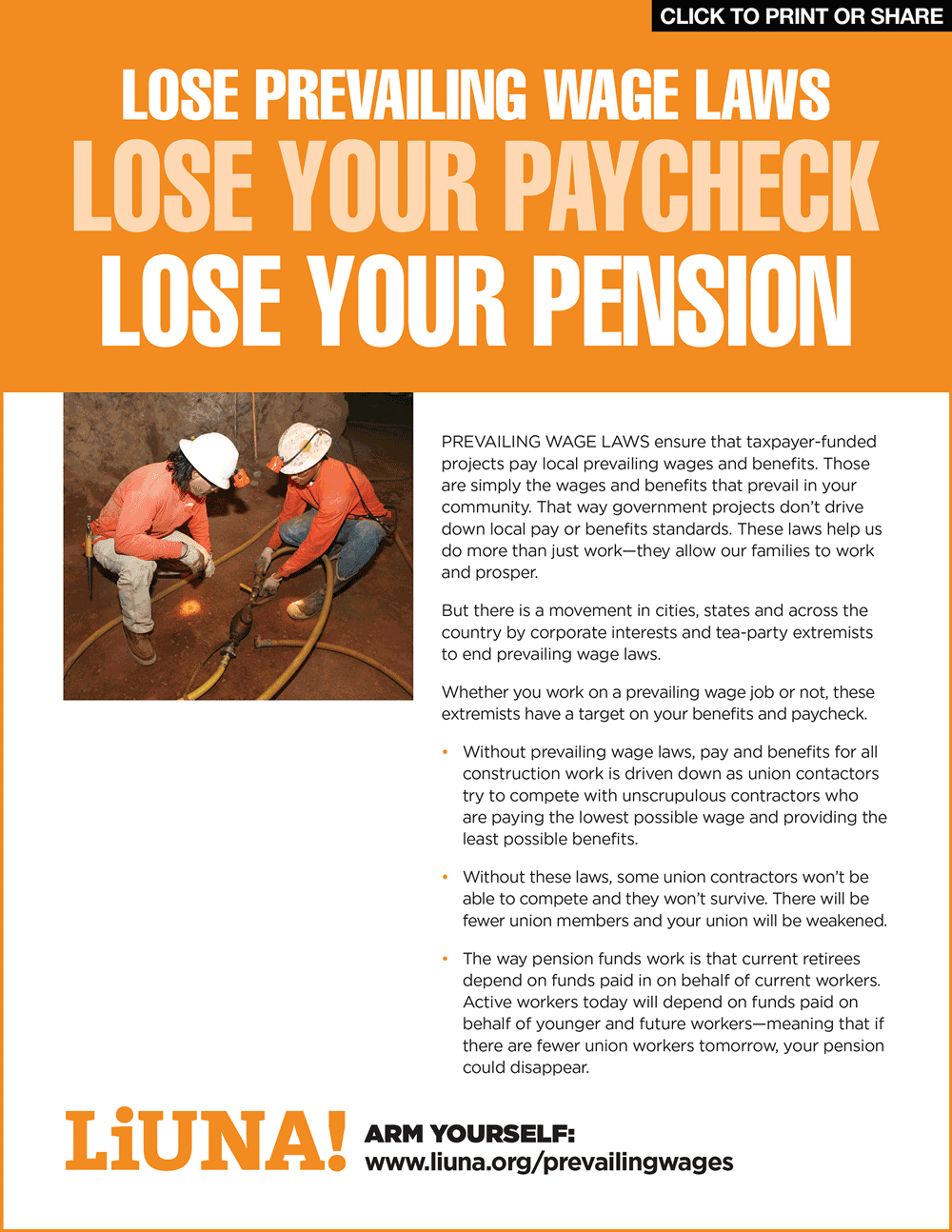 The U.S. Department of Labor (DOL) is responsible for conducting wage surveys and determining the local prevailing wages. DOL collects project wage data and then determines the prevailing rates for each construction classification in each county and publishes the rates at www.wdol.gov. LIUNA participates in wage surveys to protect the livelihood of LIUNA members. Find out more in LIUNA’s Field Guide to Davis-Bacon Prevailing Wage Surveys or check the prevailing wage determinations for your area.